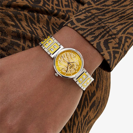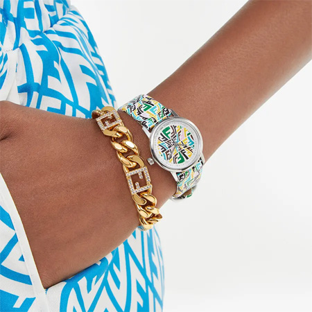 這款鏈?zhǔn)酵蟊?,吸引人的金色是它的亮點(diǎn),拋光和拉絲不銹鋼的表殼,金黃色太陽紋的表盤,散發(fā)出高貴的氣息,表盤白色的FF“Vertigo”印花圖案,增添神秘感,讓人忍不住想探究一番,搭配衣服都變得起來。