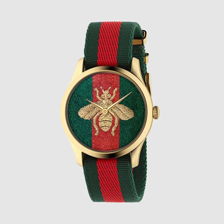 Gucci Garden仍是品牌取之不竭的靈感來(lái)源,為各個(gè)系列提供了豐富的動(dòng)植物圖案。這款表盤上配有Gucci蜜蜂圖案,是富有歷史意義的圖標(biāo),金色的表框充滿了成熟的味道,搭配經(jīng)典的紅綠撞色尼龍表帶,氣質(zhì)非凡。