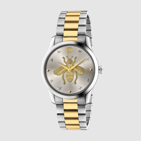 這款腕表混搭精鋼和黃金色 PVD 雙重材質(zhì),打造出眾的 G-Timeless 系列腕表造型。銀色的表盤搭配著金色Gucci蜜蜂圖案,而時(shí)間點(diǎn)采用星星、方塊和扣式雙G等品牌標(biāo)志性元素呈現(xiàn),展現(xiàn)了品牌這些充滿魅力的色彩。
