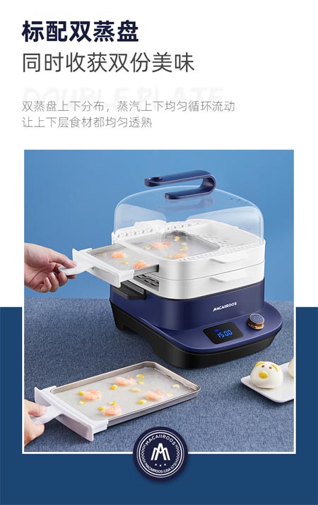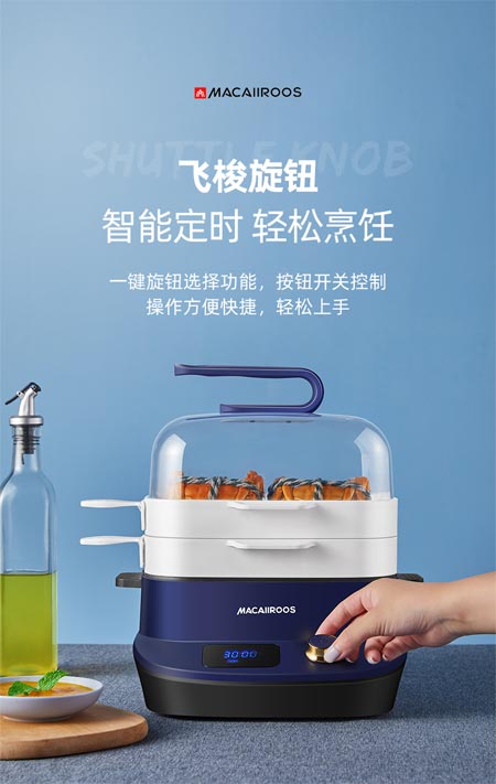 標配雙蒸盤,上下分布,蒸汽循環(huán)流動,讓上下層食材都能均勻熟透,省電又省力,自己就能制作網(wǎng)紅腸粉。其中更讓人滿意的是內部設計非常人性化,帶有飛梭旋鈕,智能定時,早上起不來,晚上可以提前預約,早上一睡醒就有美味早餐,暖暖呵護腸胃健康。