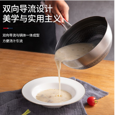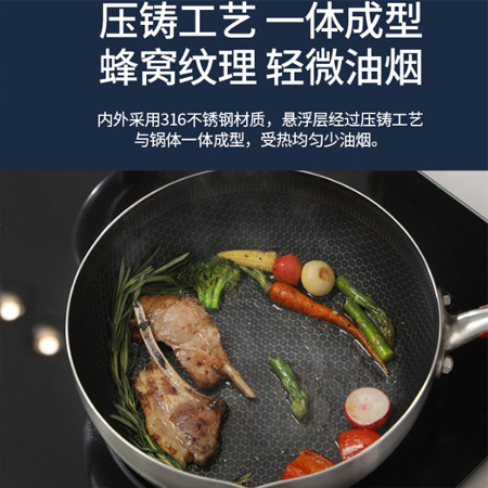 采用316醫(yī)用級別不銹鋼材質(zhì),一體成形鍋具,生產(chǎn)使用健康,耐用的健康廚具,氯化物腐蝕能力強。多層復(fù)合鋼,可通用多種灶具,導熱快速,蓄能保溫效果明顯。蜂窩紋理,讓食物懸浮于鍋壁物理顆粒之間,在食物不接觸鍋底的情況下均勻受熱,翻炒更輕松不宜粘鍋。
