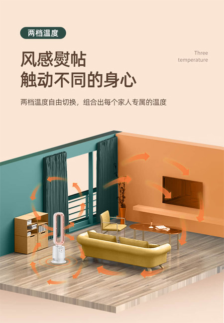 兩檔溫度自由切換,隨不同情況調(diào)控溫暖。機(jī)身輕便提拿無(wú)顧忌,放置客廳,房間,浴室,都是很好的選擇,滿(mǎn)足多種情況需求。搖頭式設(shè)計(jì),70°廣域送風(fēng),讓廳室的每個(gè)角落都有溫暖,放心孩子隨意行走室內(nèi)。底部加重座,可穩(wěn)固底座,不左右搖晃傾倒。