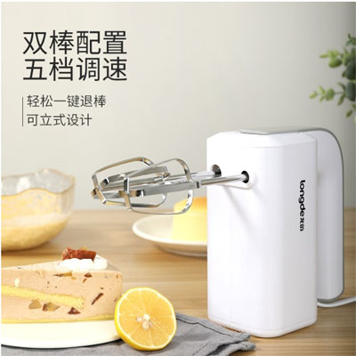 接下來這邊給你推薦的是這款longde龍的大動力純銅電機(jī)快速打發(fā)電動打蛋器,這一款的功率有120W,采用食品級攪拌器,助你放心使用,配置有雙桿攪拌,打蛋,發(fā)面,攪拌一氣呵成,動力強勁不容易飛濺液體,按鍵式制作,五檔調(diào)速,低檔攪拌,配置大動力電機(jī),高速打發(fā),循環(huán)散熱。一鍵退棒(兩只轉(zhuǎn)棒{和面棒/打蛋棒}隨意切換),滿足不同攪拌需求,想換就換,方便清洗,不用的時候也可以隨意放置桌面,再也不怕污染攪拌器!另外它的造型肯定會吸引你。這樣一個顏值與實力并存的電動打蛋器,在家做蛋糕,和面團(tuán),打奶油,打水果醬,不在話下。生活需要儀式感,在忙碌的生活中,親自動手做個蛋糕,滿滿成就感,美好幸福生活如此簡單!